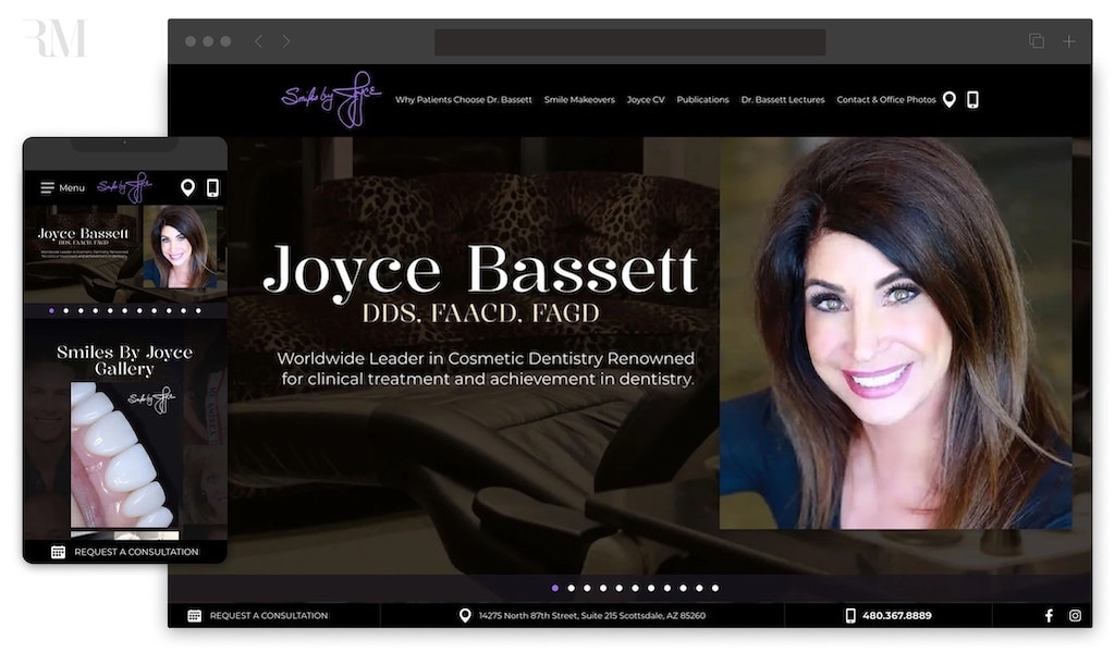 Dr. Joyce Bassett worked with Rosemont Media to develop a sophisticated, contemporary website that reflects her standing as both an accomplished cosmetic dentist and a respected industry educator. The overall design balances elegance with functionality, creating a digital presence that mirrors the high level of care and artistry offered at her Scottsdale practice.