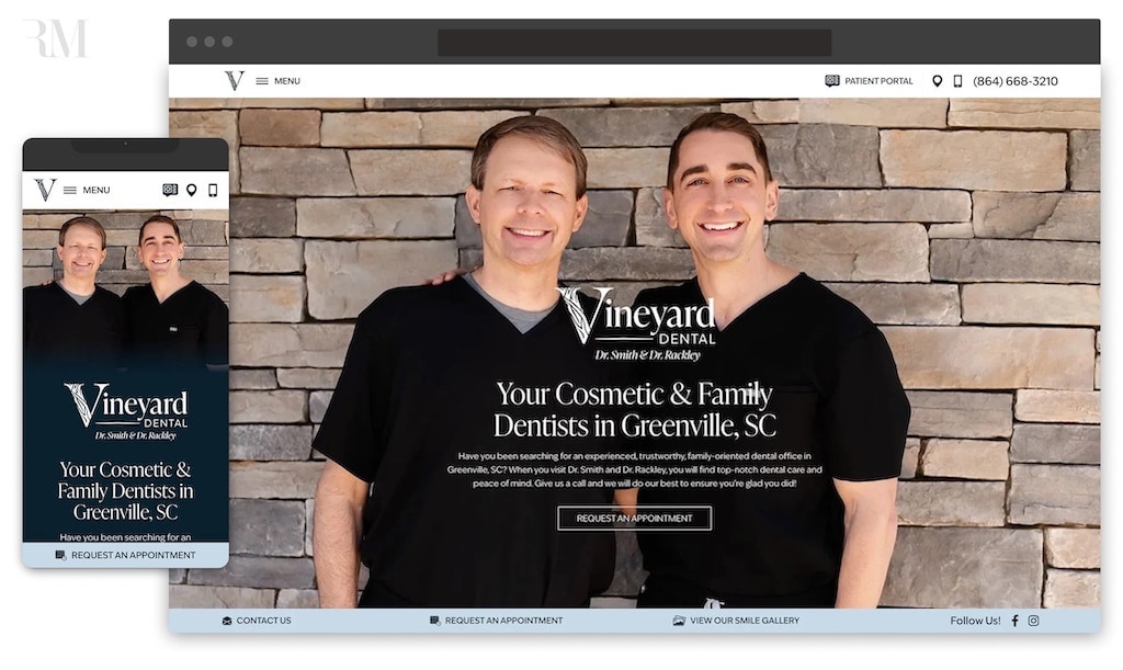 With the help of our team, Vineyard Dental created a welcoming, modern website that reflects the practice’s family-focused philosophy and strong ties to the Greenville community. The refreshed design balances a relaxed, approachable feel with a polished presentation, giving visitors an immediate sense of the comfort and care patients can expect in-office.